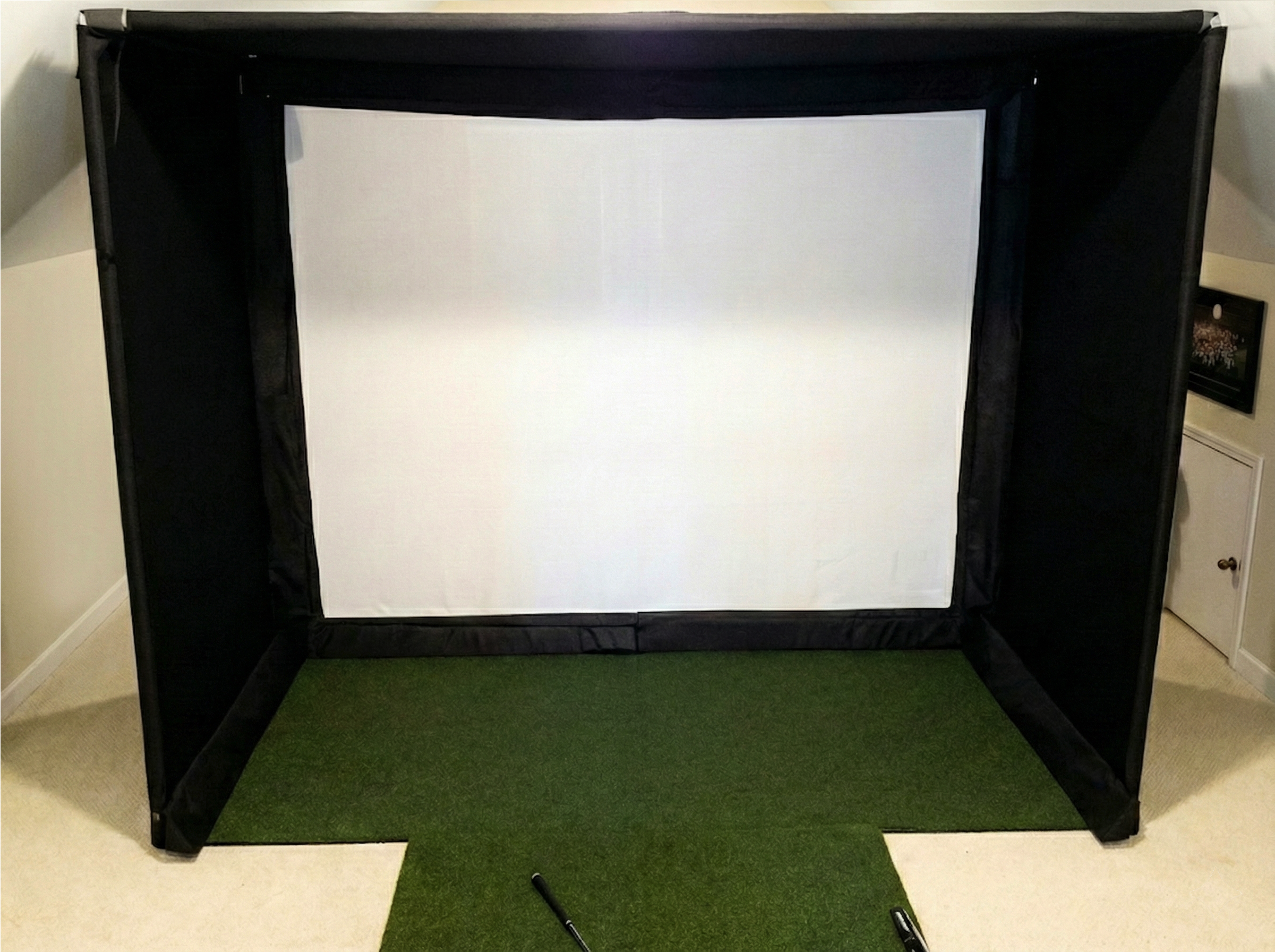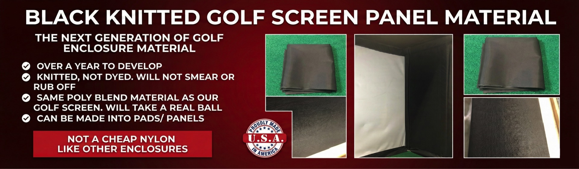 Over the past year, we've been on an exciting journey with a top US fabric supplier to perfect the ultimate golf simulator enclosure and golf enclosure with cutting-edge black panel material. Our next-generation poly blend golf screen material is now crafted with black thread—NOT dyed—resulting in a super-strong fabric that won’t smear, fade, or transfer residue onto your golf screen. Remember those frustrating moments when a miss-hit golf ball left a mark after grazing the side panel and golf screen? With our new material, that's history! This durable poly blend, identical to the one used in our sturdy golf screens, resists ripping and tearing from stray golf balls, and it comes in 120" widths to accommodate virtually any panel size for your golf simulator enclosure.