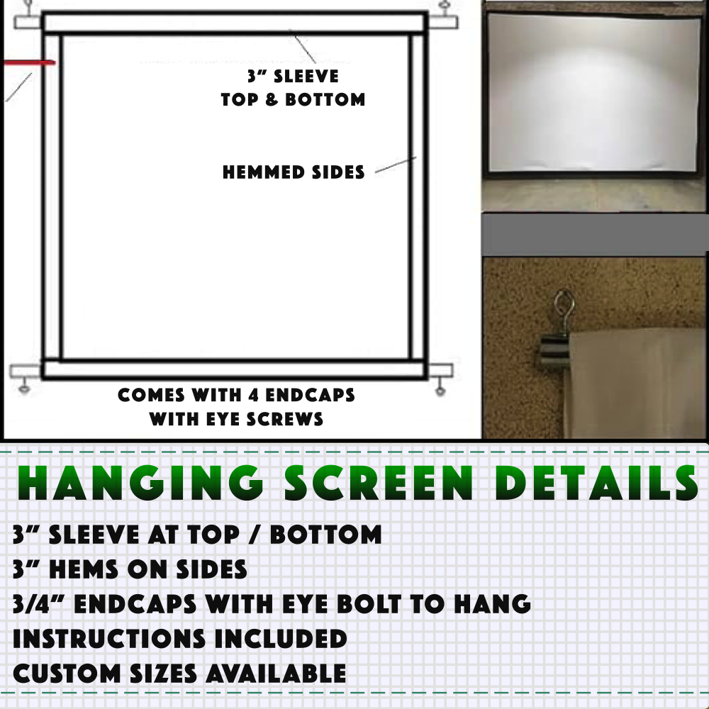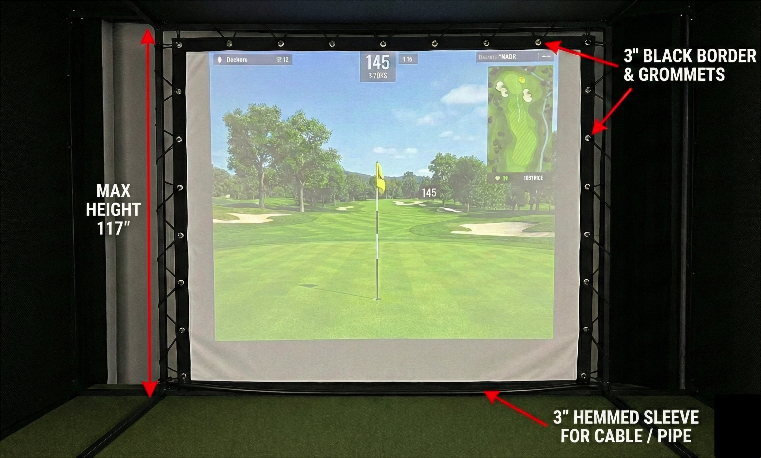 Our hanging golf impact screens are cleverly designed with sleeves at the top and bottom, reinforced with triple-hemmed sides for added strength. Simply slide a pipe through the sleeves and use our provided eye-hooks to hang your golf simulator screen from the ceiling. Available in 120 x 108 and 144 x 108, these screens adjust easily and can be draped or securely anchored for your convenience. Need something different? We offer custom-sized golf simulator screens too.